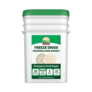 Chicken and rice dinner time staple that is now available to be stored long term with Valley Food Storage. With 6 bags of freeze-dried chicken, one of the most critical and hard-to-find foods for your emergency supply, and 2 bags of densely packed high-quality long-grain rice our chicken and rice bucket will become a staple in your food storage.