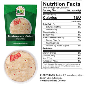 Valley Food Storage Strawberry Cream of Wheat is the best way to start the day with a hot breakfast and can be used as a healthy and delicious snack or as a dish all on its own, making it perfect for a quick and convenient breakfast or snack for the whole family. Each pouch of strawberry creamy wheat contains 10 servings.